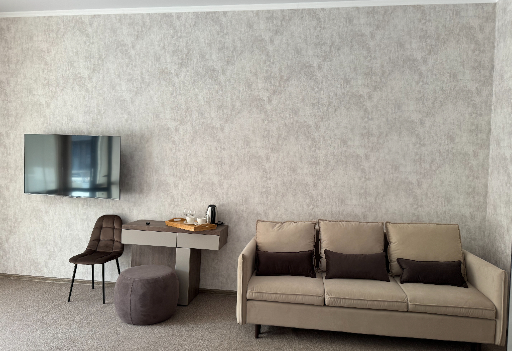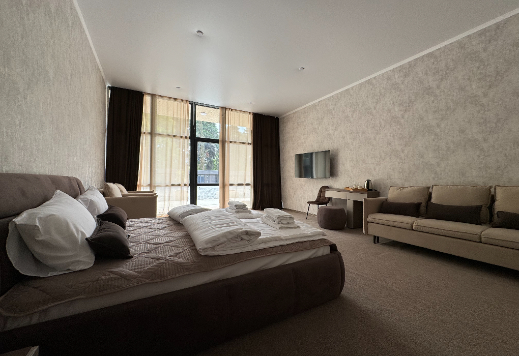 Площадь номера - 48 кв.м. 1 комната. 2 осн. места. В номере: телевизор; холодильник; кондиционер; фен; санузел. 3 доп. места: